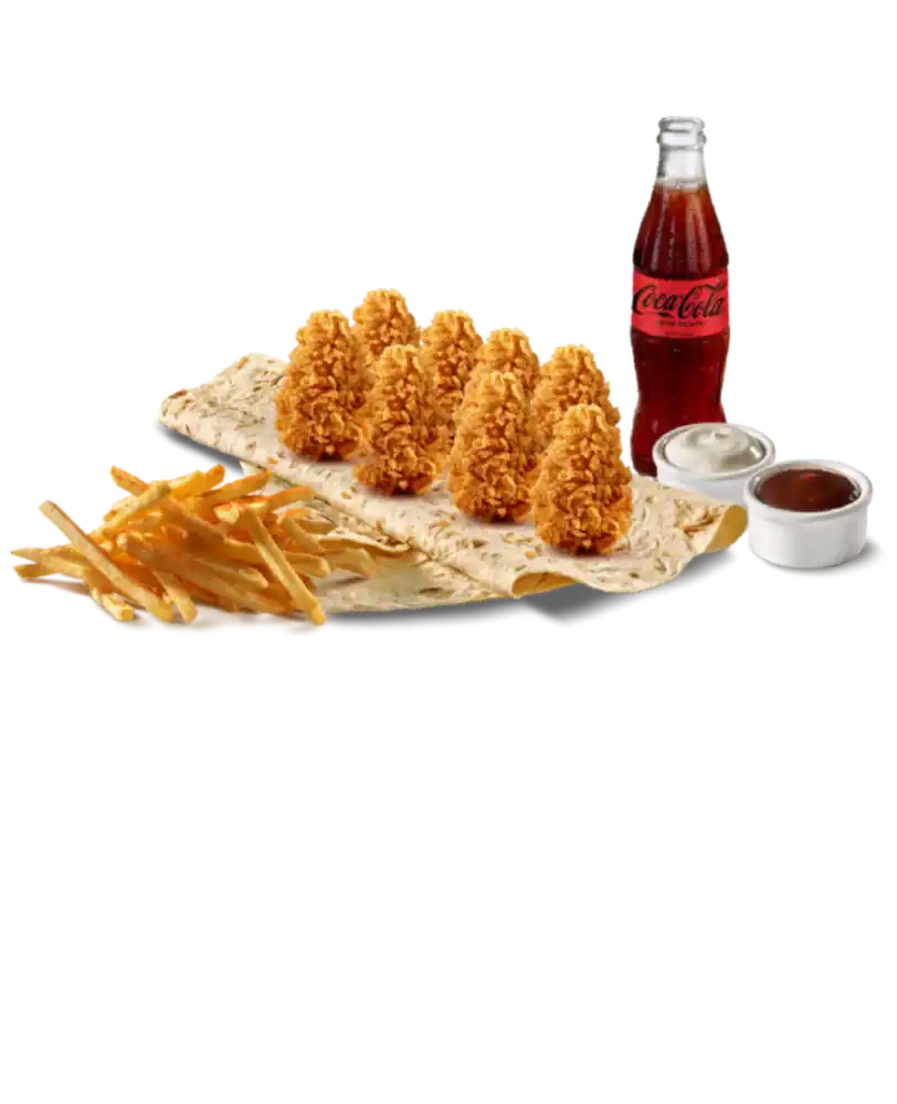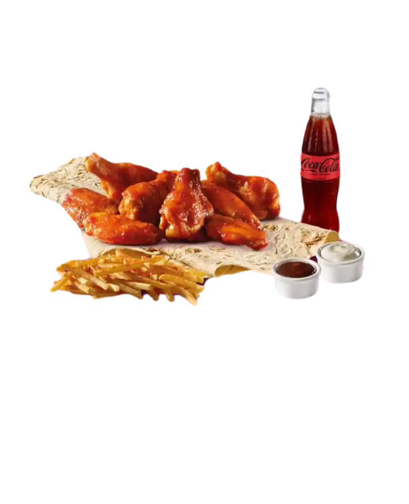 Lavaş Ekmeği Üzerine 8 adet Meksika Baharatlı Soslu Tavuk Kanatları + Baharatlı Patates Kızartması + Seçeceğiniz 2 Sos + 1 Adet İçecek