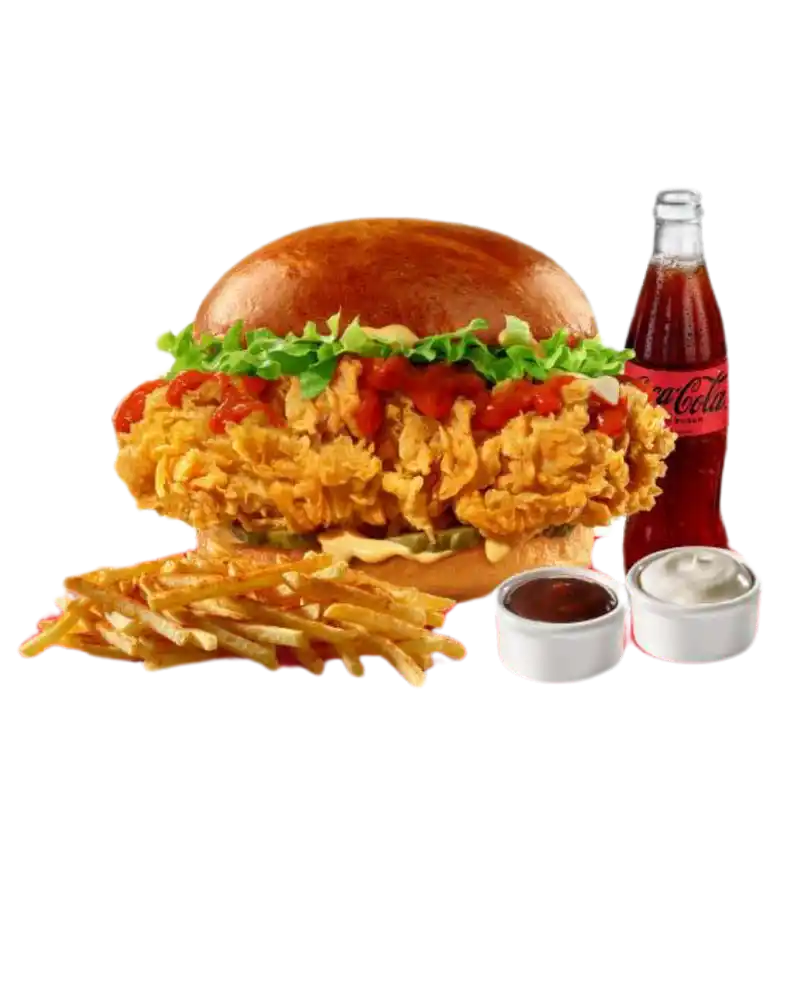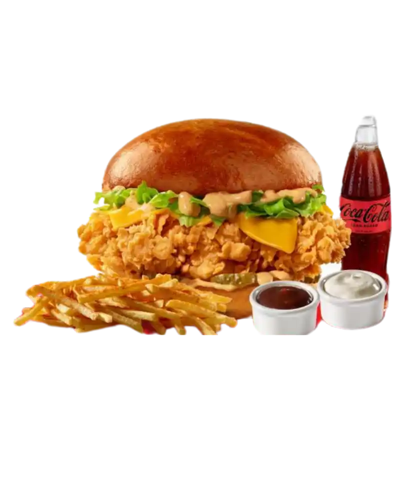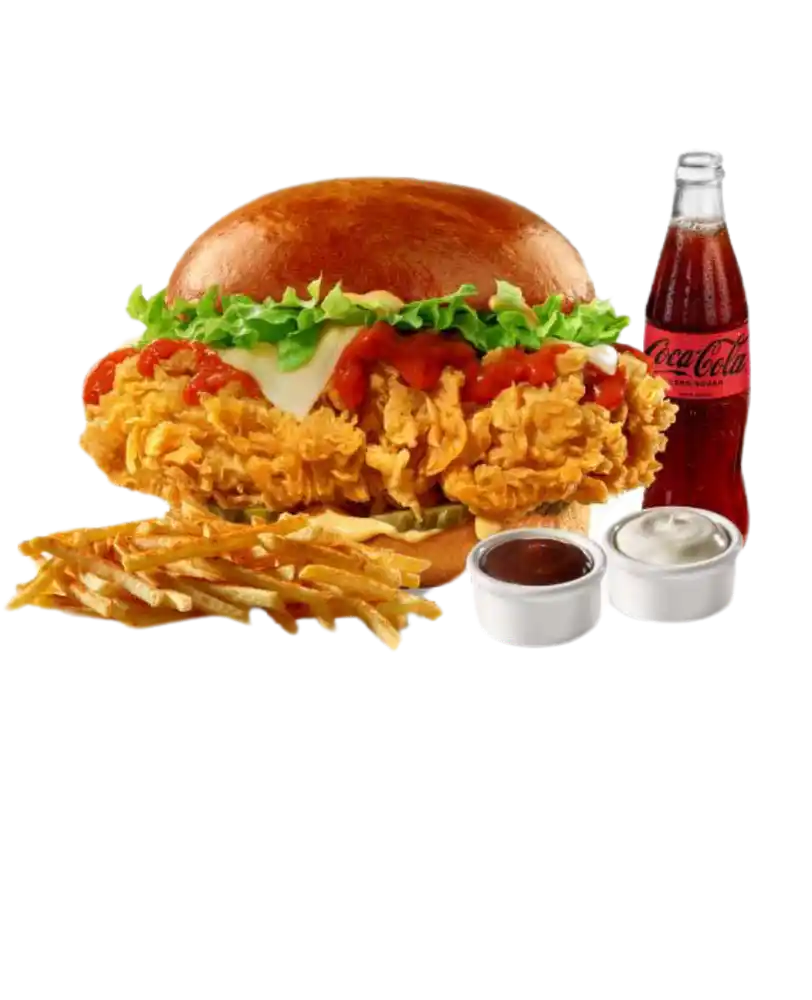 100 gr Panelenmiş Tavuk Pirzola, Dilim Cheddar, Aysberg Marul, Burger Sos + Baharatlı Patates Kızartması + Seçeceğiniz 2 Sos + 1 Adet İçecek