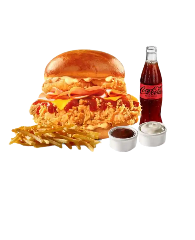 100 gr Panelenmiş Tavuk Pirzola, BBQ Sos, Burger Sos, Hindi Jambon, Çıtır Soğan + Baharatlı Patates Kızartması + Seçeceğiniz 2 Sos + 1 Adet İçecek