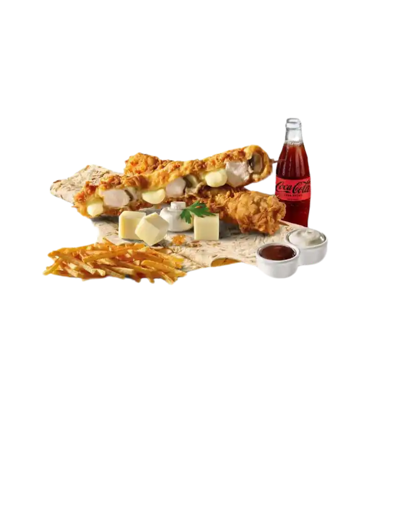 2 Adet Kaşarlı Mantarlı Cajun Şiş + Baharatlı Patates Kızartması + Lavaş Ekmeği + Seçeceğiniz 2 Sos + 1 Adet İçecek
