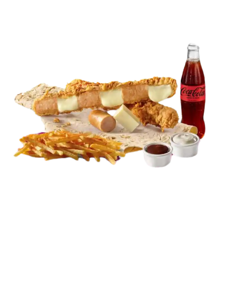 2 Adet Sosisli Kaşarlı Cajun Şiş + Baharatlı Patates Kızartması + Lavaş Ekmeği + Seçeceğiniz 2 Sos + 1 Adet İçecek